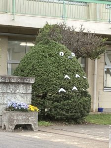 学校の校門の横の何かの木🌲に、目と耳と模様があって形もいい感