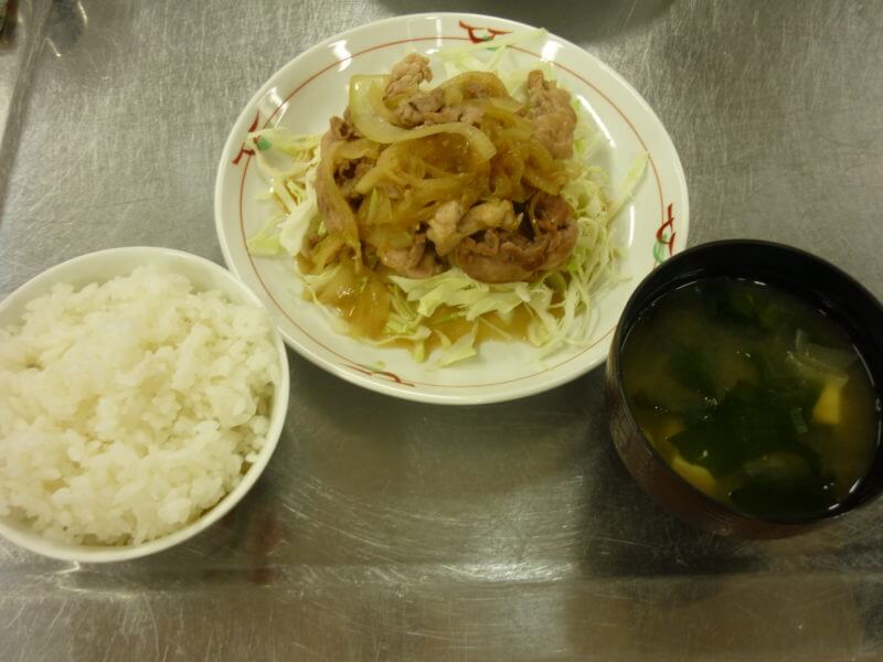 ごはん、豆腐とわかめとねぎの味噌汁、豚肉の生姜焼き。