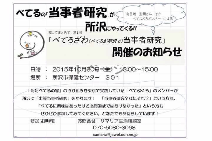 さて、突然ですが10月30日(金)にあるこでやっている当事者研究同好会の本家【べてるの家の当事者研究】がなんと、所沢にやってきます!!