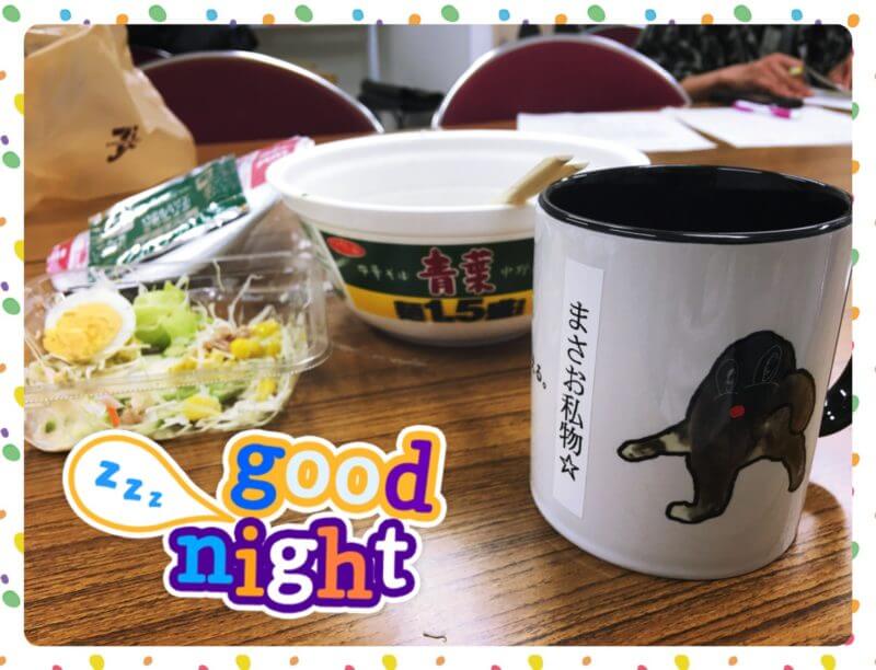 写真は本日の夜食(保健センターで勉強会があったため)と、今日ももぐりんのマグカップです。笑