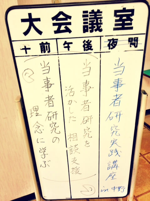 2012年7月15日 / 最終更新日時 : 2012年7月15日 arco 地活あるこの日常 べてるの家の当事者研究実践講座in中野 に、やって来ました〜(´▽`) これから、午後の部の「当事者研究を活かした相談支援」という講座に参加します! X “べてるの家の当事者研究実践講座in中野” に対して0件のコメントがあります。 ふみふみ より: 2012年7月20日 8:40 PM 最近日々の生活が「お客さん」のためか否か「割と好調」なので、当事者研究に期待していまふ……♪しかしあまりにも漠としすぎているのですが(汗)