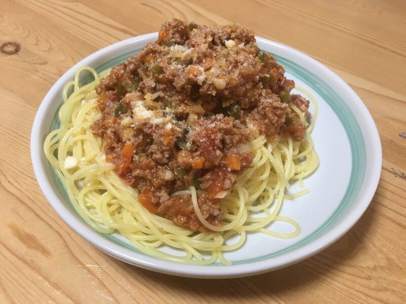 で、今回はミートソースパスタ。市販のものに対抗してという訳ではありませんが、手づくりはどんな味になるか、興味津々です。