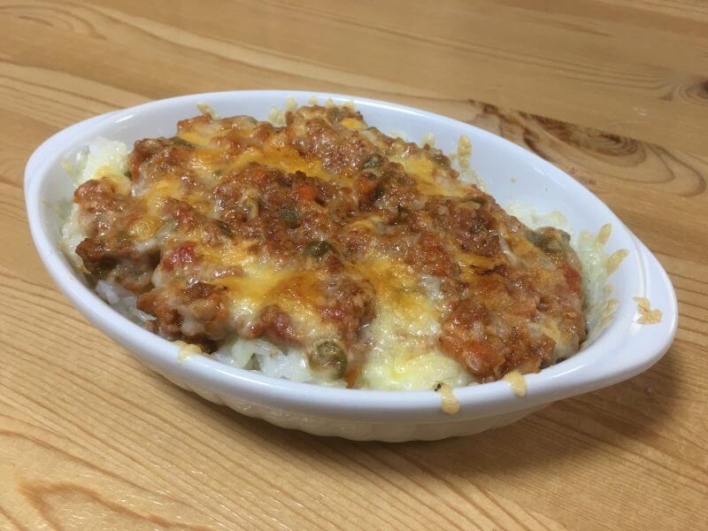 粉チーズのコクもでています。成功です。はるあんさんのレシピ本には、「ミートソースごはんにしても」と、ミートソースドリアのようなたべ方も勧められています。つぎの食事でトライしようかな。
