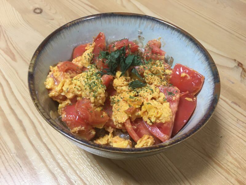 香りが立ったら、ざく切りトマトを投入、さっと炒めたらさっき溶いた卵も入れ、おおきく混ぜ、好みの固さにして、おかか醤油ご飯にかける。あまっていた青じそ、ドライパセリを散らし、彩りをつけたら、ハイ、完成!