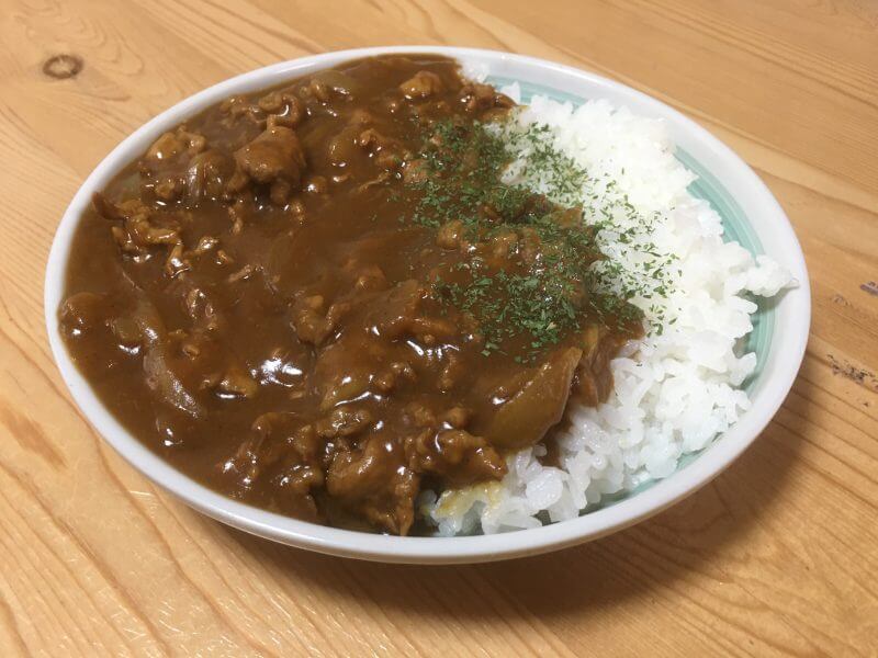 沸騰したら、火をとめ、カレールゥを半箱分投入します。今回ジャワカレー辛口を使用しました。ひと煮たちさせたら完成!ご飯とともに器に盛りつけ、色どりにドライパセリをふりかけたら、食卓へGO!
