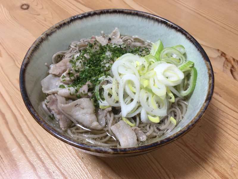 大蒜のへたをとり、潰して芽をとります(芽は焦げ易い)。豚バラを4~5cm幅に切ったら、大蒜を鍋に入れ炒め、色づいたら、水、豚肉を加えます。更に創味シャンタン、白だし、塩を入れ、少し煮たら、茹でた蕎麦を器に盛り、うえからスープをかけて、小口切りにした長葱をあしらったら、ハイ、完成!今回は、あおさも振りかけてみました。