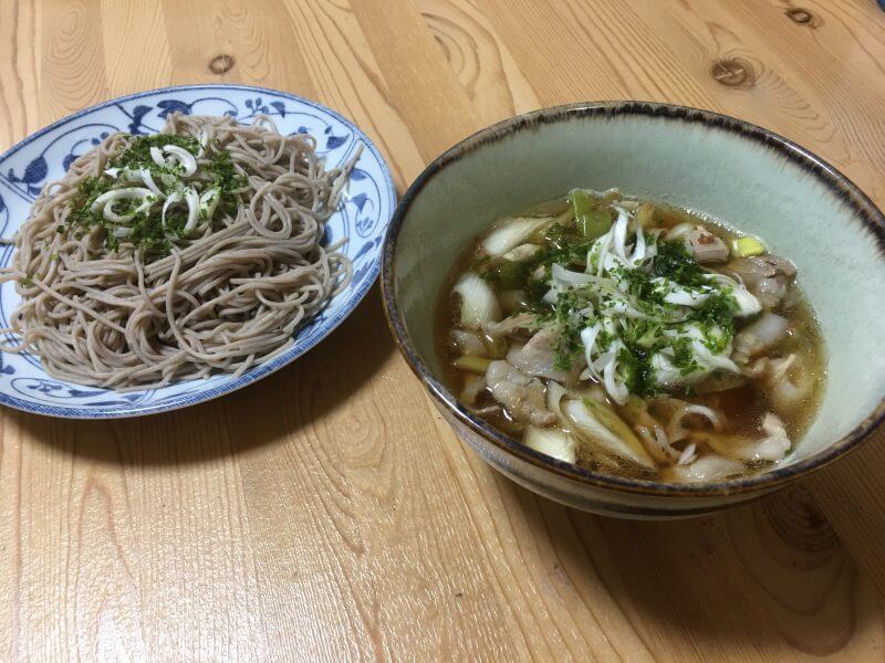 実食。蕎麦をつゆにつけ、たべると、生姜の香りが非常に鼻腔を刺激します。匂いも料理との感を強くもちます。豚肉の旨味も前面におしだされています。薬味の役割をする長葱の小口切りは小葱のほうが良かったかもしれません。ちょっと辛みが強い印象でした。(レシピには小葱とありました)。