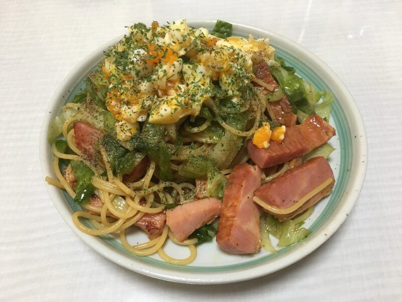 スパゲッティを氷水で締めた効果がでて、コシのある仕あがりとなっている。やや塩気がキツかったかな。塩胡椒や各種調味料が結構あったから、レタスはシャキシャキとした歯応えがあり、これは良かった。茹で卵は固茹でにならず半熟でしたが、パスタやほかの具材と一緒に口(くち)にすると、まろやかになり、おいしい。これはこれで幸いしました。