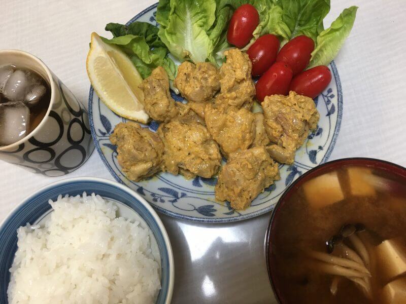 添えた味噌汁は、しめじ、ミョウガ、絹豆腐。豆腐の具はひさびさで、優しい味に心癒されました。まあ、「タンドリー風チキン」とは統一性がなく、和洋折衷なんだけどさ。
