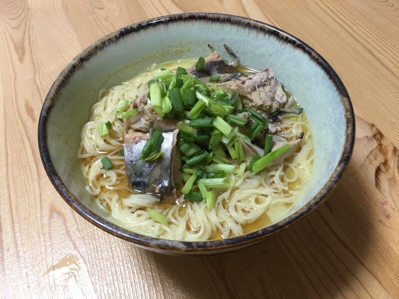 ヤスナリオさんの「サバ缶豆乳カレー冷や汁」、ご飯が多すぎ、あたかもお茶漬けの如き様相を呈してしまった。同メニューの初めての作製。その反省を活かし、今度はご飯の替わりに茹で、氷水で締めたそうめんで、ふたたびトライ。ヤスナリオさんもこう書いておられます。「ご飯の代わりに茹でたそうめんを用意して、ぶっかけそうめんにしてもひんやりウマシですよ。」と。
