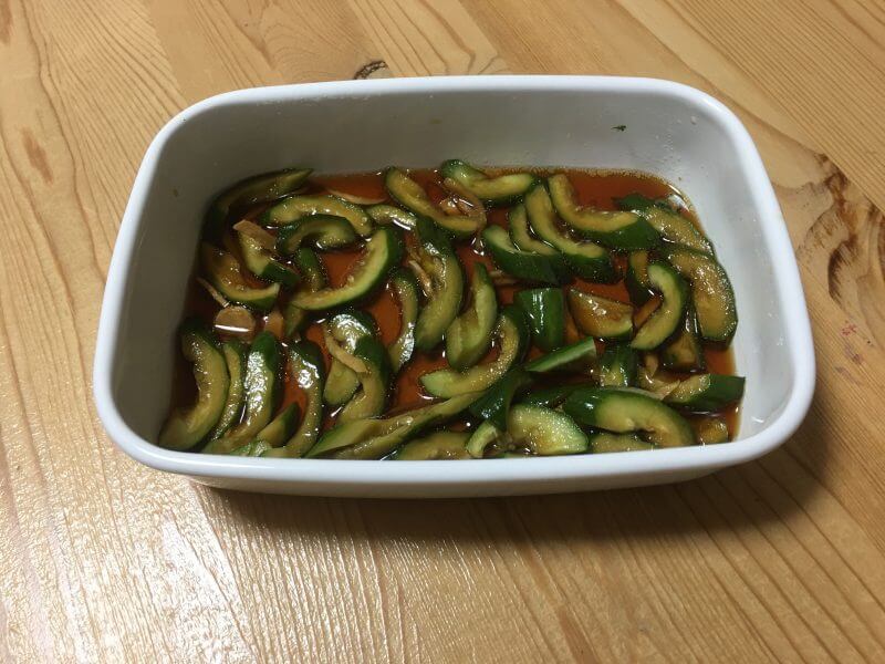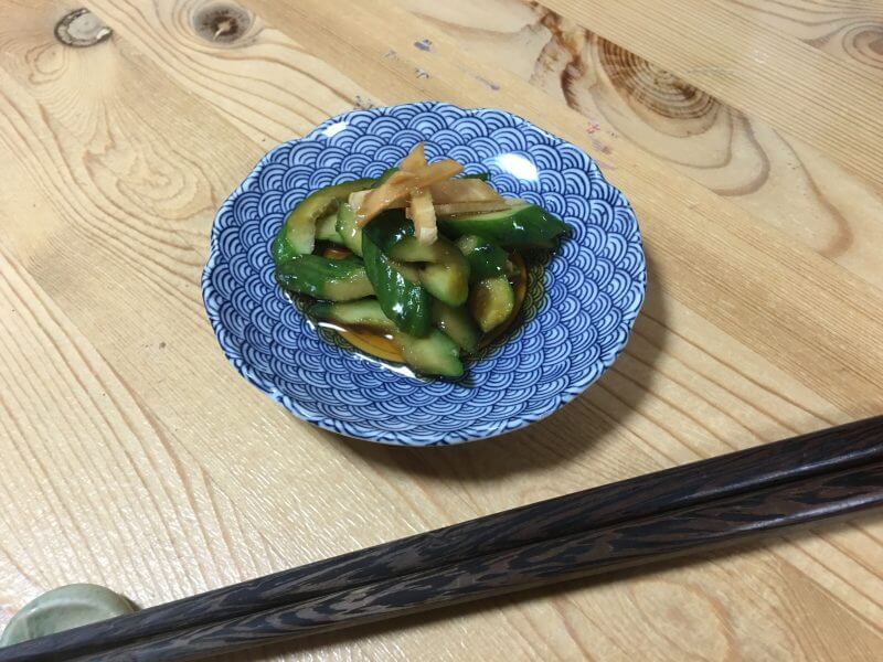 きゅうりはヘタを落とし、縦半分に切り、スプーン等で種をこそぎとり、細切り(斜め切り)にし、容器に入れ(今回琺瑯(ほうろう)を使用)、生姜の細切り、砂糖、醤油、酢、ごま油を加え、混ぜておき、冷蔵庫でひと晩漬けたら、ハイ、完成!