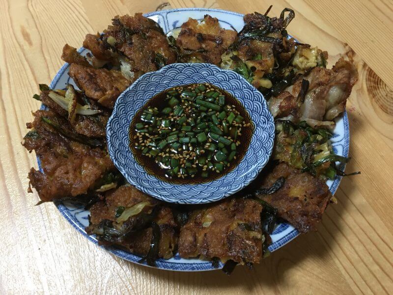 玉葱は薄切り、ニラは長さ5cmに切り、生地を混ぜ、玉葱とニラを加え、たれを混ぜておく。焼いていきます。ごま油を、フライパンに中火で熱し、生地を流し入れる。豚バラを切らずに生地のうえに並べ、塩をして、3~4分焼く。裏返してさらに3~4分焼き、何回か裏返して両面を、フライ返しなどでおさえつけながら焼いていき、焼けたら、一度フライパンからおろし、俎板(まないた)等でたべ易い大きさに切って、ふたたび、ごま油を敷いたフライパンに戻し、こんがりと焼く。そして、たべる直前に再度焼き、たれとともに器に盛ったら、ハイ、完成!