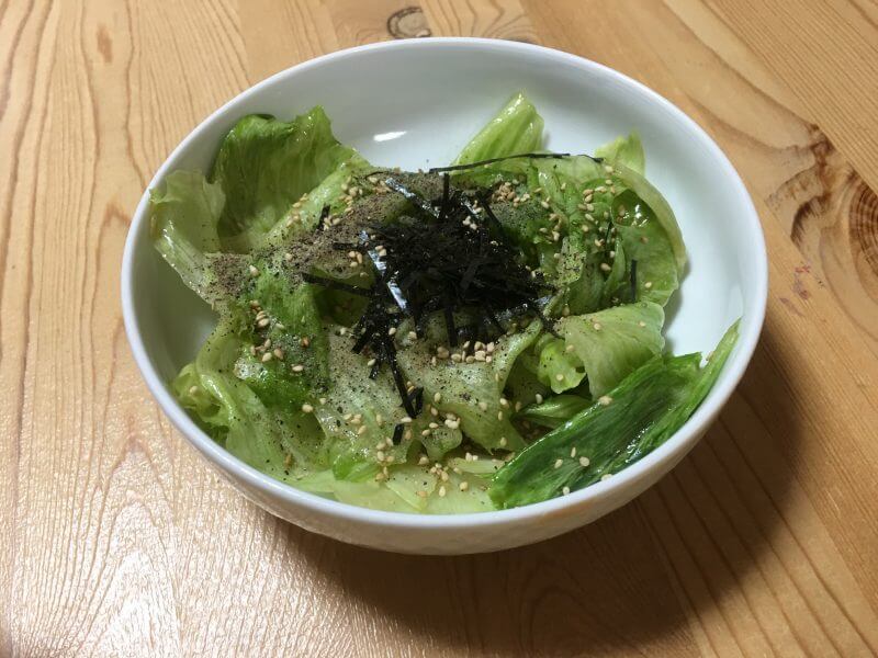 白だし、水、醤油、味の素、すりおろし大蒜、ごま油をボウルに入れ、よく混ぜ、白く濁ったら、ドレッシングの完成。レタスを適当な大きさに千(ち)切(ぎ)り、ドレッシングの入ったボウルに加え、よく和える。この時レタスを洗うが、水を良く切ってからボウルに入れる。器に盛り、黒胡椒、刻み海苔、いりごまをかけたら、ハイ、完成!