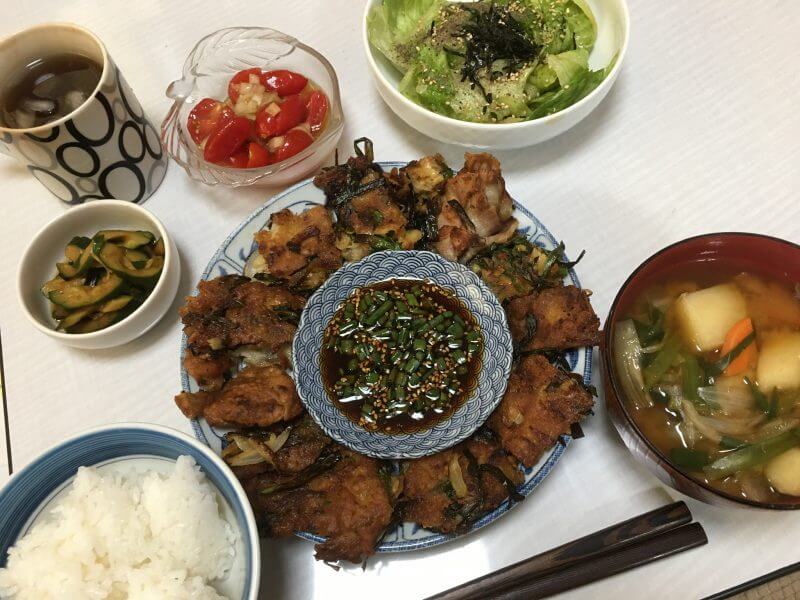 食卓に、ご飯、味噌汁、マリネ、しょうゆ漬け、冷たい烏龍(ウーロン)茶とともに並べます。たべていきます。頂きます!