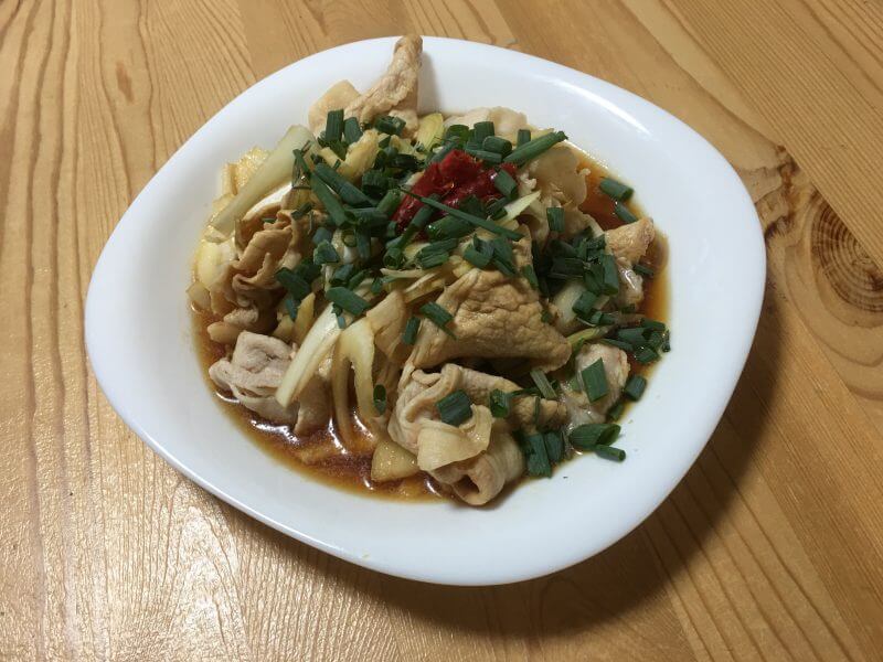 生生姜の皮を剥(む)き、千(せん)切(ぎ)りに、玉葱は薄切りにする(生姜の皮は後でつかいます)。南蛮だれをつくる、醤油、酢、砂糖、味醂を合わせて玉葱を入れ、唐辛子2本をそのままホールで加える(ぼくは種をとりました)。湯を沸かし、酒を入れ、先程の生姜の皮を入れ、豚肉をしゃぶしゃぶし(この時湯の温度を下げる)、ペーパーで挟んで押して水分をとり、出汁(だし)に浸けていく。出汁に浸けた豚肉に、玉葱を入れた南蛮だれを加え、馴染(なじ)ませ、器に盛り、万能ねぎの小口切りを散らしたら、ハイ、完成!
