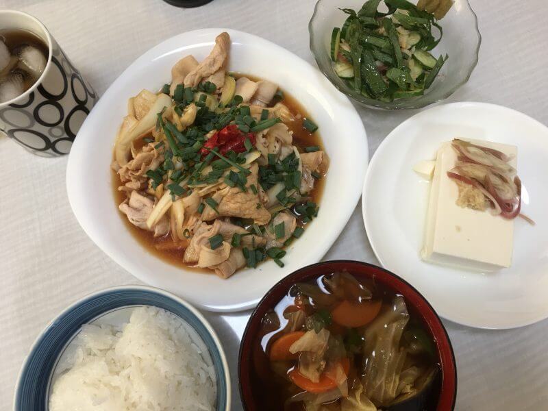 豚肉がとても柔らかく、おいしい。たれの甘味、玉葱の辛み、唐辛子の刺激があるなか、肉まで甘いと感じる程です。唐辛子の種はぬいて正解でした。ピリッとくるのは脇役程度の存在感で良い(しかし名バイプレイヤー)。絹豆腐の奴(やっこ)(おろし生姜、ミョウガのせ)、キュウリ、ミョウガ、生姜、大葉の刻んだものをごま油、柚子胡椒、ポン酢醤油で和えた小鉢を付けました。最終的に奴(やっこ)を小鉢に投入し、冷や汁的な味わいとなりました。これもおいしい。空腹にしていたのでペロリと平らげることができました。さっぱり漬けは暑いなか、良かったです。また来季かな。
