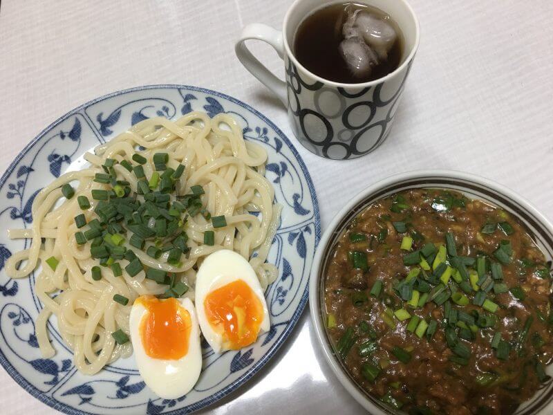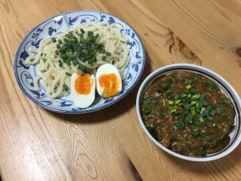 うどんをたれに浸(つ)け、啜(すす)る。豚ひき肉の旨み、クミンシード、花椒(ホワジャオ)の風味が前面に押しだされていて、おいしい。ラー油の辛さは殆ど感じない。香ばしいのは、すりごまの作用か。いずれにしろ美味。茹で玉子(半熟)もたれに浸(つ)け、たべる。卵の黄身が、たれの味をまろやかにしてくれる。旨(うま)い。うどん1玉はなくなったが、たれが余ったので、もう1玉解凍し、今度は温かいまま、たれと和え、たべる。こちらもおいしい。カレー味のジャージャー麵みたいだ。