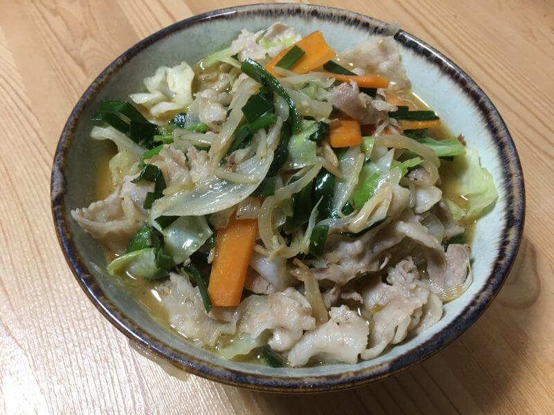 材料、市販のラーメン1食分、豚バラ肉100g、キャベツ(元のレシピは白菜となっていましたが、なかったので、キャベツで代用しました)200g、もやし100g、玉葱1/4個、ニラ・にんじん各少々、大蒜(にんにく)2かけ、ラード大さじ2(ぼくはサラダ油で代用)。