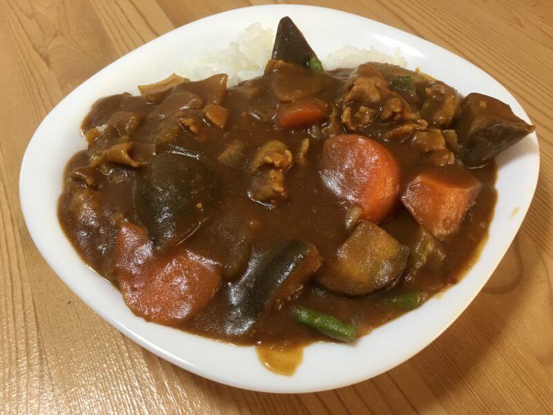 じゃがいもは皮を剥(む)き、3cmくらいの角切りに、にんじんは大きめの乱切りに、玉葱は3cmくらいの角切りに、ピーマンも大きめに切り、茄子はヘタを取り、大きめの乱切りにし、いんげんは筋を除き3cmくらいに切る。豚バラ肉はたべ易い大きさに切る。大きな鍋にサラダ油大さじ2を熱し、豚バラ肉と、いんげん以外の野菜をすべて入れ、炒めていく。大蒜(にんにく)と生姜をすりおろし入れる。全体に油が廻り、玉葱が透明になったら、水1700ccを加え、煮る。15分後、じゃがいもの硬さをみて、煮えていれば火を止め、異なる種類のカレールゥを入れ、溶かす。ルゥが溶けたら、いんげんを加え、再加熱し、更に5~6分煮る。煮えたら、皿に温かいご飯、好みで薬味をのせ、カレーをかけたら、ハイ、完成!
