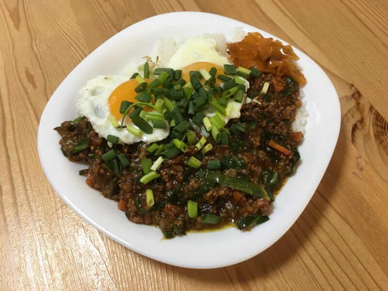 玉葱、野菜類をすべてみじん切りにする。大蒜、生姜もみじん切りに。鍋にバター20gを溶かし、玉葱を飴色になる迄(まで)炒めていく。飴色になった玉葱を取りだし、油大さじ1、みじん切りの大蒜と生姜各小さじ1を入れ、炒め,合いびき肉250gを加え、更に炒めていく。刻んだ野菜類も投入し、炒め合わせる。水300ccと飴色玉葱を入れ、馴染ませて、カレールゥ100gを加えて、溶かし、少し煮たら、キーマカレーはOK! フライパンに卵2個を割り落とし、目玉焼きをつくる。皿に温かいご飯、キーマカレー、目玉焼き、福神漬(好みの薬味で)を盛り、万能葱の小口切りを散らしたら、ハイ、完成!