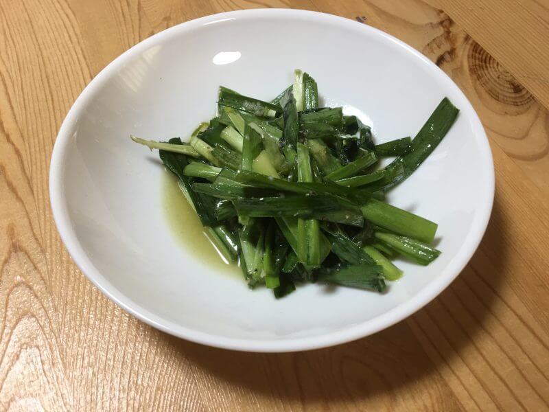 材料、ニラ100g、大蒜(にんにく)2/3かけ、塩小さじ1/2、レモン汁小さじ1、ごま油大さじ1、黒胡椒適量、味の素7ふり。(仕上げに黒胡椒適量)。