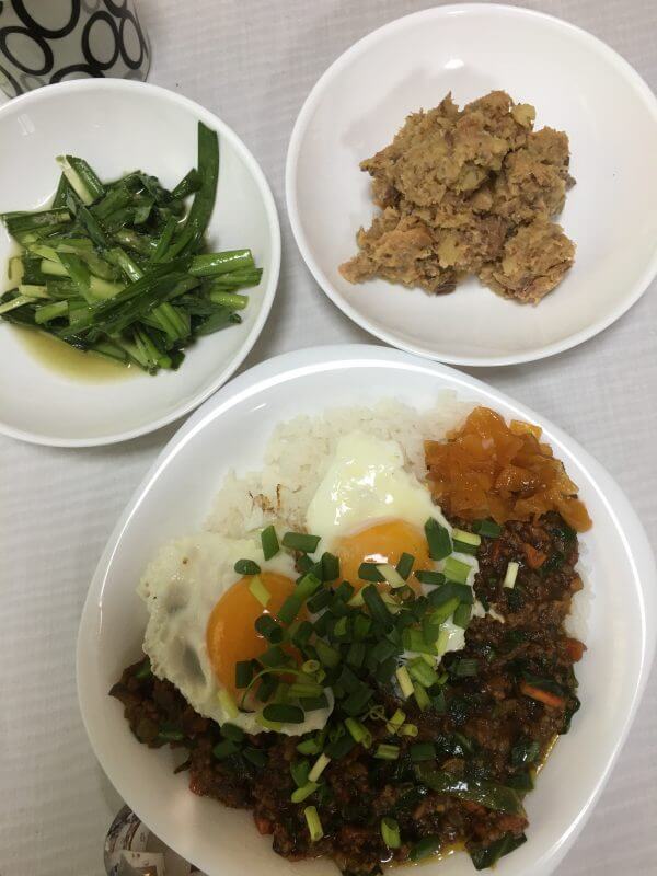 キーマカレーを軸として、ニラ、ポテサラと時計の歯車のように舌と眼が回転していく。キーマカレーは、リュウジさんの「無水ヨーグルトキーマカレー」に比して、カレールゥ(ジャワカレー中辛)のスパイシーさや野菜の存在感が際立つ印象です。福神漬が、ひと休みのクッションになり、食欲がそそられ、たべつづけます。おいしい。成功です。