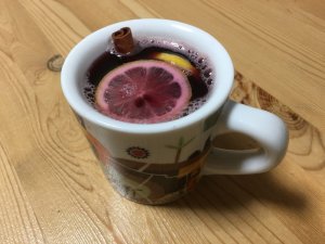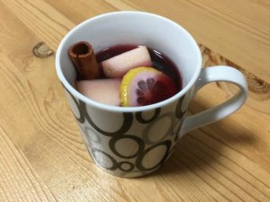 シナモンスティックの香り(ニッキかな?)とりんごのまろやかさ、柑橘類(レモン)の爽やかさ、砂糖と蜂蜜(ぼくはこれらを半々にしました)の甘み等が効いておいしい。勿論主役は赤ワインの筈ですが、脇を固める上述のバイプレイヤーたちが、ワインの元の味をひき締めている印象。カップに残ったりんごも甘み、スパイス等染みて、おいしかった。