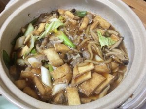 材料、冷凍うどんひと玉、豚肉(今回バラ肉を使用)100g、キャベツ40g、しめじ1/2パック、油揚げ2枚、長葱適量、水400cc、ほんだし小さじ1、醬油50cc、味醂50cc。