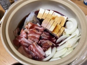 材料(2~3人前)、木綿豆腐一丁(300g)、豚バラ肉220g、玉葱1/2個、白滝200g、砂糖大さじ1、醤油大さじ3、味醂大さじ4、白だし大さじ2、赤ワイン大さじ4、(彩りで)小葱適量。