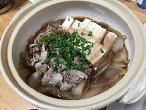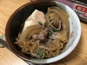 まず、おつゆを。おぅ! 肉の脂が出汁となり、各種調味料と入り混じって、コクに溢(あふ)れている。微(かす)かにだが、赤ワインを思わせるような味わいがある。豚肉は冷凍を解凍したものをつかったので、品質の劣化ということも含めて、硬くならないか懸念(けねん)されたが、そういうこともなく、レシピのように、柔らかくて美味です。玉葱は良く煮込まれていて甘く、白滝にも味が良く染みている。豆腐は香ばしく、存在感を発揮しています。やはり、様々な調味料がキーポイントだったようですね。深い味わいに舌鼓(したづつみ)を打つしかない状況。2~3人前とのことでしたが、ご飯一膳を一緒にペロリと平らげることができ、ああ、満足満足。