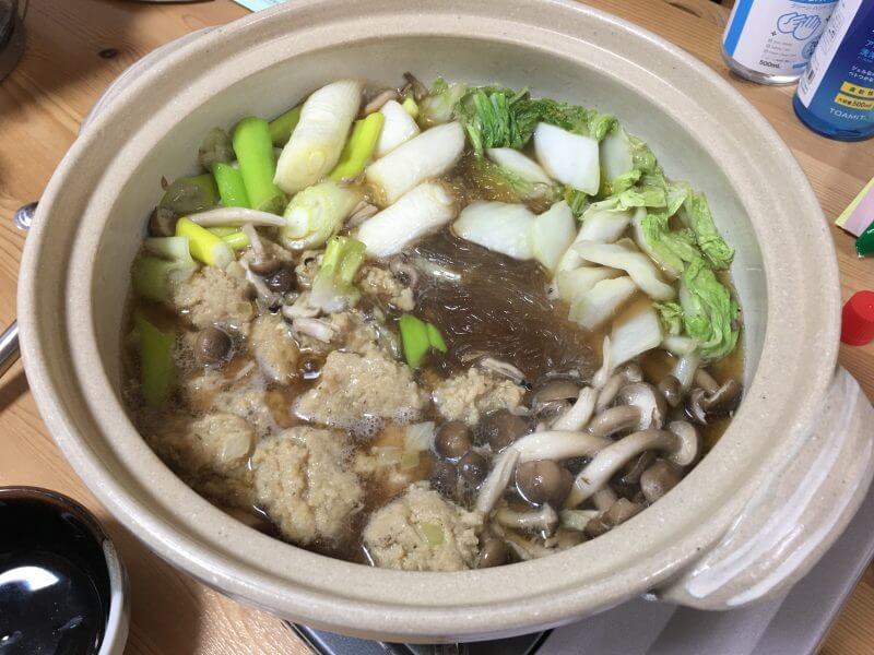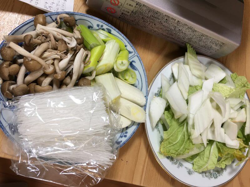 材料(1~2人前)、豚ひき肉150g、玉葱みじん切り30g、生姜みじん切り小さじ1、卵1個、白菜適量、しめじ1/2パック、春雨64g、長葱1/2本、塩小さじ1/4、ブラックペッパー適量、片栗粉大さじ1と1/2、水500cc、白だし80cc、創味シャンタン小さじ1/2、酒大さじ1、醬油大さじ1。