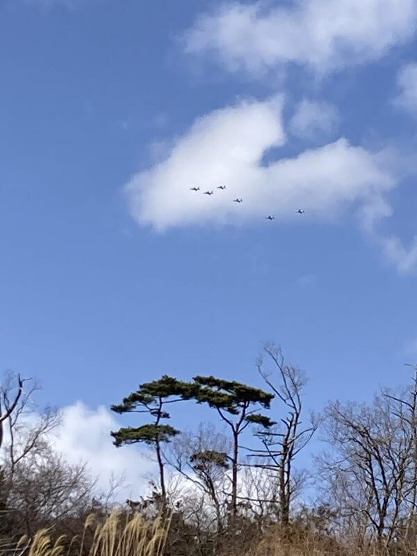 そして、この東松島市には自衛隊の基地があり、なんとそこにオリンピックで空を飛んだブルーインパルスの基地があるんですね!この日も訓練をしていて連隊で飛んでいるところを見ることができました!復興の象徴かのように空を美しく飛んでいるところをみてとても感動しました。